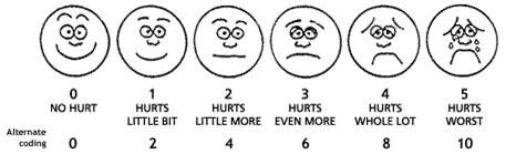 The management of your pain is of great importance to us. We will be assessing your level of pain from the time of admission until you receive our post operative call at home. During your stay at the facility, you will be repeatedly asked to rate your pain using a numerical scale (1-10), or for children, the “Faces Pain Scale” (shown below).